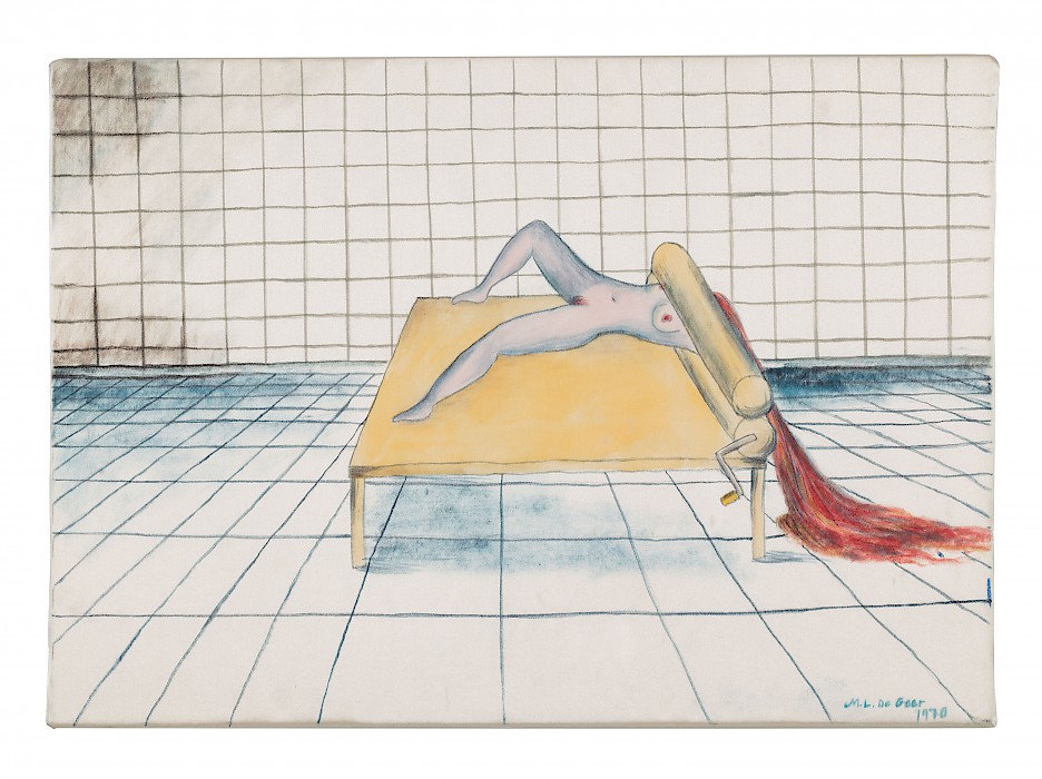 Kvinna med huvud i mangelbord / Woman with her Head in a Mangel 1970 Gouache på siden / gouache on silk, 24,5 x 33 cm